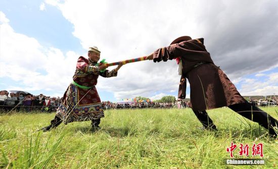 8月8日,甘肅張掖市肅南裕固族自治縣皇城鎮(zhèn)第十六屆民族文化旅游藝術(shù)節(jié)暨傳統(tǒng)體育運動會拉開帷幕。賽馬、押加、拔棍、頂杠子、射箭、背垛子等一項項少數(shù)民族傳統(tǒng)體育運動項目,吸引上萬觀眾觀看。近年來,肅南縣將體育項目與歷史、民族、文化、旅游有機結(jié)合,打造民族體育節(jié)慶品牌和運動會,使民族傳統(tǒng)體育發(fā)展增加了新的內(nèi)涵,逐步形成了全民健身品牌,影響力不斷擴大。圖為參賽選手進(jìn)行拔棍項目比賽。 趙琳 攝