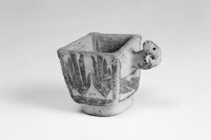 另一件人形三角折帶紋雙足罐,單耳,夾沙紅陶質(zhì)地,高約11厘米,圓鼓的肚子,身著黑色帶狀紋、豎條紋和“Z”字形紋的華麗衣衫,足穿一雙平底大鞋,鞋頭尖而深,似乎是一個(gè)孕婦形象。這可能是3700年前女性著裝的樣式。