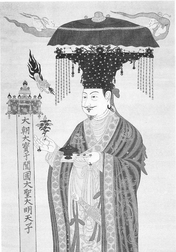 在敦煌莫高窟第98窟中,一幅高2.82米的人像壁畫尤其令人矚目。畫像中人物頭戴冕旒,身穿兗服,手持香爐,衣服上繡著日月龍獸,完全是漢族帝王的形象,但看人物面相卻不似中原人模樣。他到底是誰(shuí)呢?通過畫像旁邊的榜題“大朝大寶于闐國(guó)王大圣大明天子”,可知人像上這位氣宇軒昂的美男子,就是于闐國(guó)王李圣天。由于身份特殊,于闐國(guó)王李圣天這身供養(yǎng)人畫像,也是在莫高窟發(fā)現(xiàn)的最大的君王肖像畫。