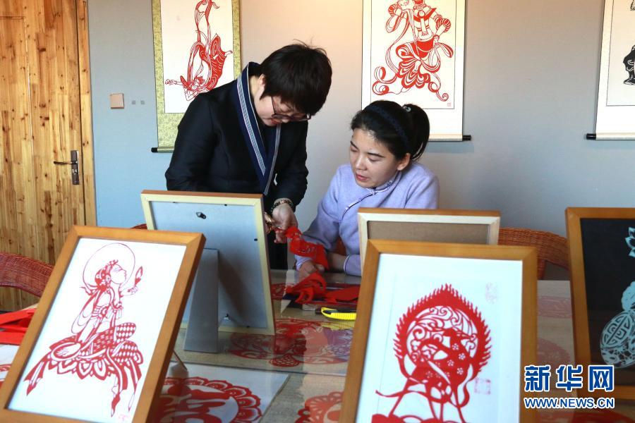 在甘肅敦煌小鎮(zhèn)鳴沙書院,“敦煌剪紙”酒泉市級非物質(zhì)文化遺產(chǎn)代表性傳承人莊生娟(左)在自己的工作室內(nèi)指導學員剪紙(2020年12月31日攝)。新華社發(fā)(張曉亮 攝)