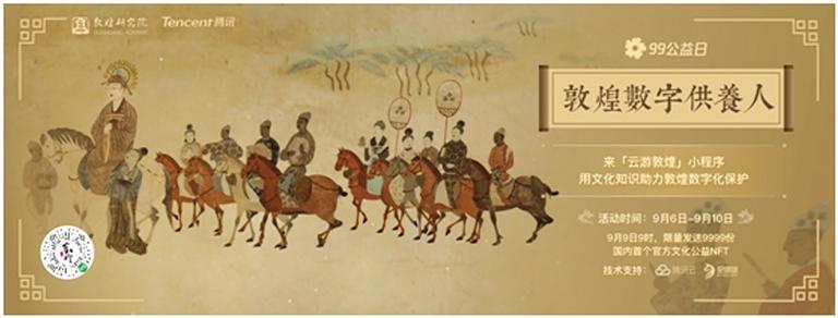 除了創(chuàng)意互動帶來的新奇體驗,敦煌研究院與騰訊在“99公益日”還將發(fā)布文博行業(yè)首個公益NFT(Non-Fungible Token,非同質(zhì)化通證)藏品。9月9日9時開始,用戶在“云游敦煌”小程序參與文化答題即有機會獲得這款限量數(shù)字藏品。這份NFT藏品生動呈現(xiàn)了《張議潮統(tǒng)軍出行圖》與《宋國河內(nèi)郡夫人宋氏出行圖》壁畫的細(xì)節(jié),并首次讓用戶在線上觀看到敦煌莫高窟第156窟的全景。