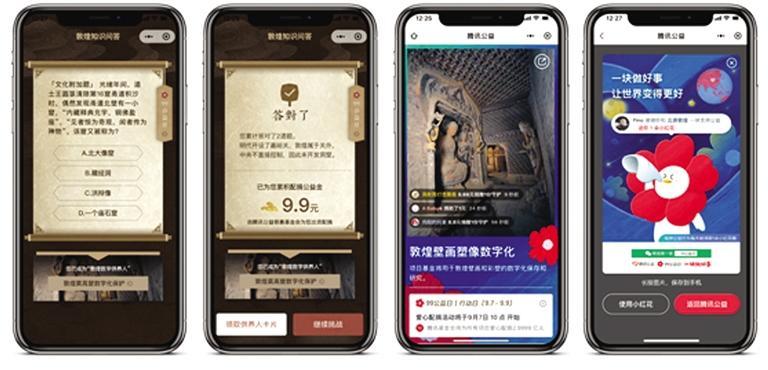 “云游敦煌”的“聲動畫語”讓壁畫“活”了起來,用戶可以通過觸點的方式進(jìn)入到不同的篇章中,通過動畫欣賞敦煌壁畫中晚唐時期的生活場景,并獲得與當(dāng)時社會民俗、服飾等相關(guān)的文化知識。觀看完動畫后,用戶還可以通過參與文化問答挑戰(zhàn),為中國敦煌石窟保護(hù)基金會募集善款。答對題目越多,募集到的善款也將隨之增多??铐棇⒂沈v訊公益慈善基金會直接出資,并全部用于敦煌莫高窟第427窟、145窟、138窟的數(shù)字化保護(hù)工程。通過這種方式讓每一位參與的用戶,都能夠用自己的知識為石窟數(shù)字化保護(hù)助力,成為新時代的敦煌“數(shù)字供養(yǎng)人”。
