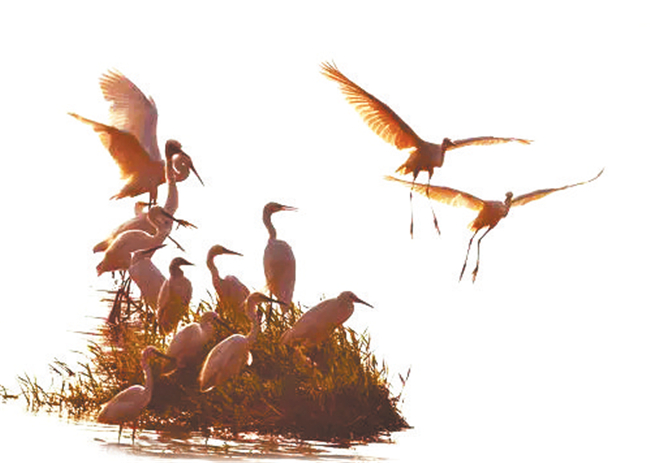 去年12月底,一位老師來西峰講學(xué),我陪先生到濕地海綿公園轉(zhuǎn)悠,剛剛步入人行道,發(fā)現(xiàn)遠處湖水中央有七八只白鷺在棲息,朝陽斜射到湖面上,水波瀲滟,像細碎的金斑,白鷺安詳?shù)叵礈熘鹈幸恢话槅瓮戎绷⒅∷埔乐桓P直纖細的鐵絲,半張著翅膀,欲飛不飛的樣子,剩下的幾只白鷺在戲水,迷人極了。