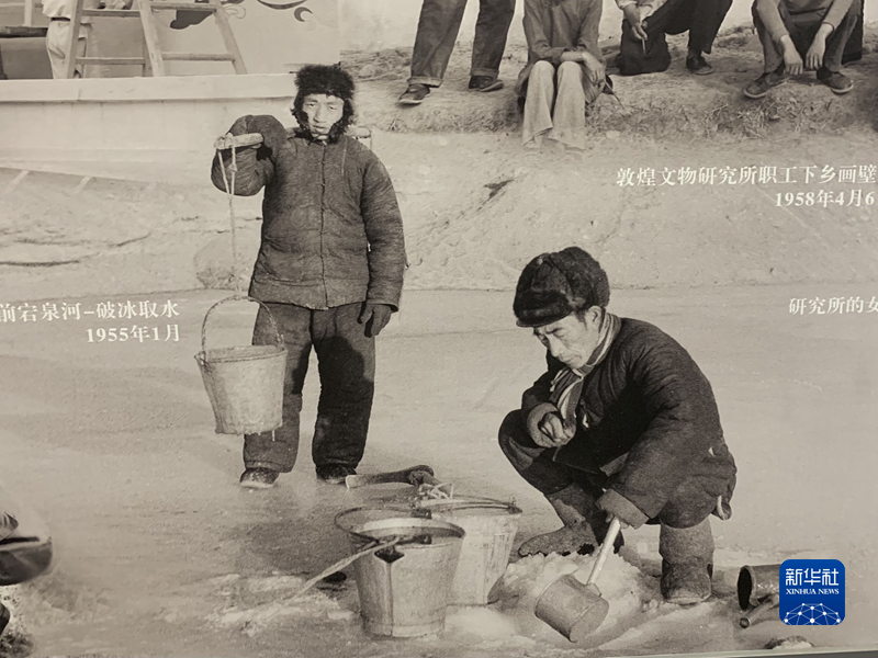 展覽的第二部分,主要呈現(xiàn)1944年“國(guó)立敦煌藝術(shù)研究所”成立后,幾代文化工作者扎根大漠、開拓進(jìn)取的歷程。該部分展出了大量老照片,如上世紀(jì)五六十年代,文化工作者破冰取水、耕作勞動(dòng)的場(chǎng)景。