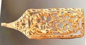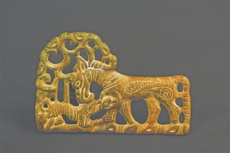 受草原文化影響,虎的造型更具藝術(shù)性,形式亦豐富多彩。甘肅省博物館藏的西周虎紋耳形銅鉞,整體似半環(huán),鑄猛虎紋,虎背為刃。尾下有短胡兩穿,尾、雙爪上鑄凹槽,虎首下彎,張口含銎,露牙睜目,領(lǐng)內(nèi)有一圓形穿孔。甘肅省文物考古研究所藏的戰(zhàn)國(guó)金帶鉤,鉤首為長(zhǎng)頸龍首狀,頸部為三棱狀,肩部三角形邊框內(nèi)鏤空雕鑄對(duì)稱和狼形圖案。鉤身為長(zhǎng)方形,邊框內(nèi)鏤空雕刻一組正反相對(duì)稱的虎噬大角羊圖案。張家川回族自治縣博物館藏的戰(zhàn)國(guó)晚期的虎形金飾片,虎尖耳上翹,大嘴張開(kāi),鬃毛卷曲上翹,尾前卷于背部與鬃毛相連,四足著地做行走狀,栩栩如生地展現(xiàn)了虎行走的動(dòng)感之態(tài)。甘肅省博物館藏的戰(zhàn)國(guó)虎噬羊紋金飾片,虎張口露齒,垂首蹲踞,虎口銜羊,前爪按住羊肩部,后爪抓住羊臀部,羊四肢跪地作掙扎狀,活靈活現(xiàn)地展現(xiàn)出猛虎捕食羊的瞬間動(dòng)態(tài),形象逼真。這些虎文物都是此次展覽中的亮點(diǎn)。