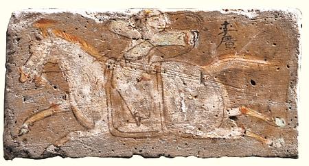 敦煌市博物館藏的西晉李廣射虎彩繪畫像磚表現(xiàn)的是“李廣射虎”的情景。李廣頭戴冠,八字須,著交領(lǐng)窄袖衣,系腰帶,下身著裈,騎于疾奔的馬上返身張弓待發(fā)。李廣射虎的故事被記載于司馬遷《史記》中,原文是:“廣出獵,見(jiàn)草中石,以為虎而射之,中石沒(méi)鏃,視之石也。因復(fù)更射之,終不能復(fù)入石矣。廣所居郡聞?dòng)谢?,嘗自射之。及居右北平射虎,虎騰傷廣,廣亦竟射殺之。”