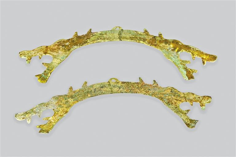 此套鎏金龍虎飾件中的虎飾件:長(zhǎng)36.1厘米,寬9厘米;龍飾件:長(zhǎng)41厘米、寬7.7厘米。為春秋戰(zhàn)國(guó)時(shí)期龍、虎形銅璜,圓拱形,頂部之上有拱形穿,兩端分別為龍首與虎首,口部張開,露出尖牙。在新石器時(shí)代,璜一般是佩戴于胸頸部的裝飾品,具有象征身份地位的作用。