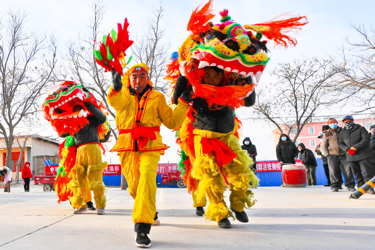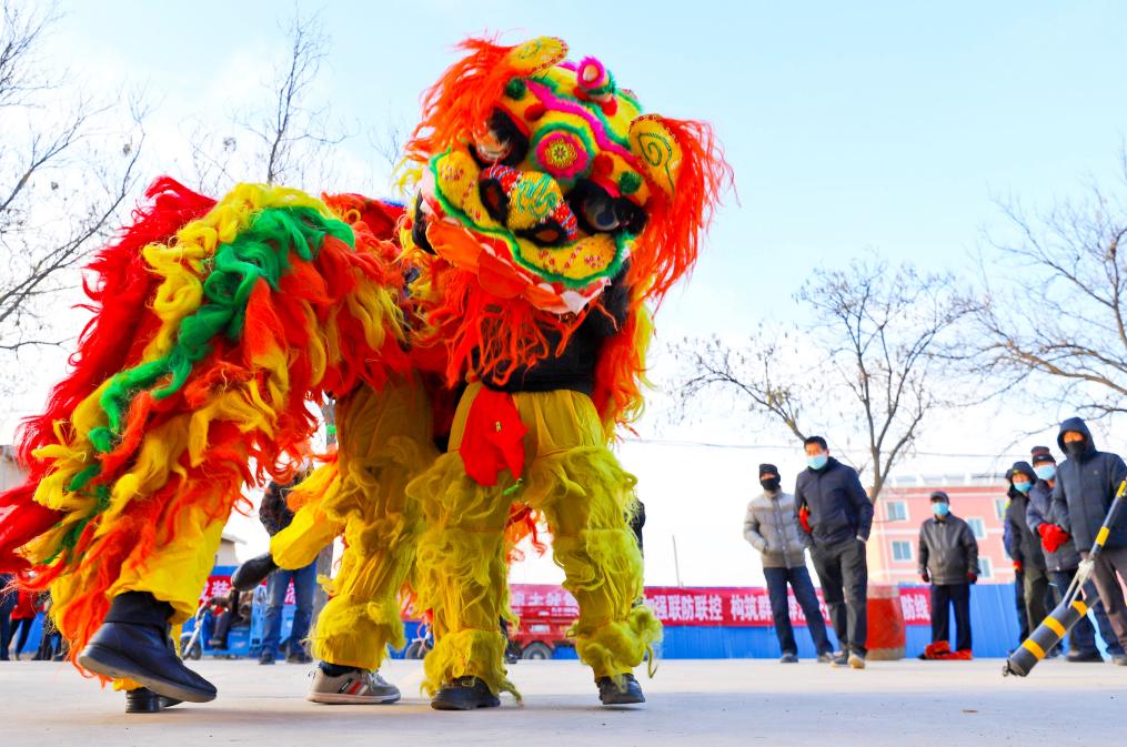 1月26日,甘肅省張掖市甘州區(qū)堿灘鎮(zhèn)草湖村文化廣場上,村文化隊為鄉(xiāng)親們表演了獅頭擺,追繡球,飆起來,威掃天下知的獅舞,迎接即將到來的新春佳節(jié)。