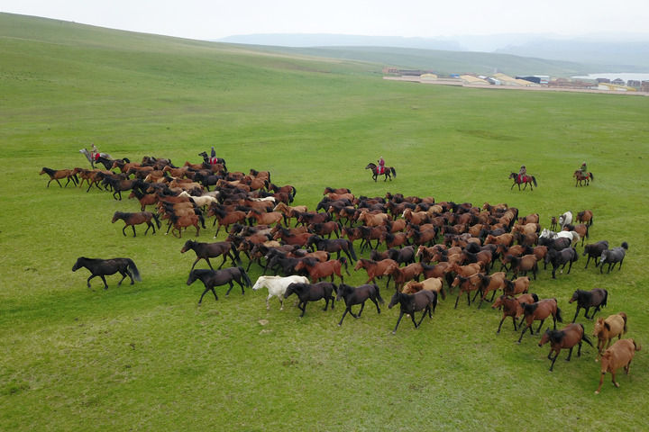 2021年6月19日,駿馬在山丹馬場奔跑(無人機(jī)照片)。新華社記者 范培珅 攝