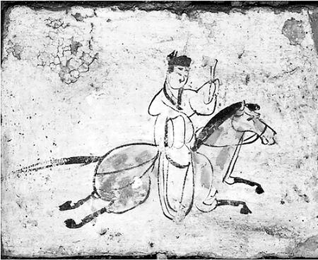 這一時(shí)期,自天子以至百官士庶,除乘車外還普遍騎馬。西晉時(shí)北方出現(xiàn)上馬時(shí)所踩的單馬鐙,南北朝后期又出現(xiàn)嚴(yán)格意義上的雙馬鐙。馬鐙的使用能減輕人們騎馬的體力消耗,有利于控制馬匹。這一時(shí)代的低級官員和百姓出行還乘驢、騾,甘肅等西北地區(qū)少數(shù)民族多乘駝,運(yùn)載貨物主要用牛車。漢地民眾出行,仍然是安步當(dāng)車。嘉峪關(guān)魏晉墓五號墓的《驛使圖》,畫面中一個郵驛使騎在馬上,頭戴進(jìn)賢冠,身穿右襟寬袖衣,足蹬長靴,左手舉木牘文書,右手持馬韁,驛騎四蹄騰空,飛奔直前。這幅畫再現(xiàn)了當(dāng)時(shí)甘肅地區(qū)驛使馳送文書的情景,也是我國古代郵驛使較早的形象資料。