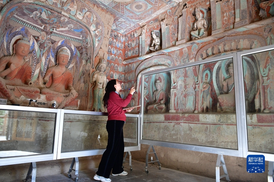 4月19日,王嬌在莫高窟第259窟做洞窟記錄。新華社記者 陳斌 攝
