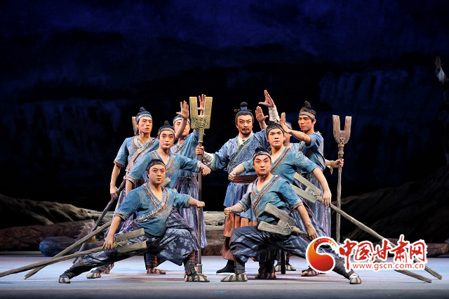 隴劇《大禹治水》是在甘肅省文化和旅游廳全程指導(dǎo)下,《黃河流域生態(tài)保護和高質(zhì)量發(fā)展規(guī)劃綱要》出臺之際,甘肅文藝工作者挖掘黃河文化蘊含的時代價值,講好“黃河故事”,實施隴原文藝高峰攀登工程、加強非物質(zhì)文化遺產(chǎn)保護傳承的具體行動。該劇將“大禹”這個上古英雄請下神壇,為他賦予了親情、愛情、家國情懷,在兩個小時的演出中,領(lǐng)銜出演“大禹”的優(yōu)秀青年演員邵炳德與雷通霞、竇鳳霞、佟紅梅等“三朵梅花”同臺飆戲,火花四濺的“開山”、扣人心弦“治水”,將大禹和先民們不畏艱險、篳路藍縷的開拓精神和奮斗精神,演繹得淋漓盡致,深深震撼著現(xiàn)場觀眾。而隴劇音樂獨有的“麻簧”、以皮影戲為表現(xiàn)手法的“月下婚禮”場景、水袖舞場景,把人物的情緒表現(xiàn)得栩栩如生,將獨具特色的隴劇藝術(shù)盡情綻放在舞臺之上。