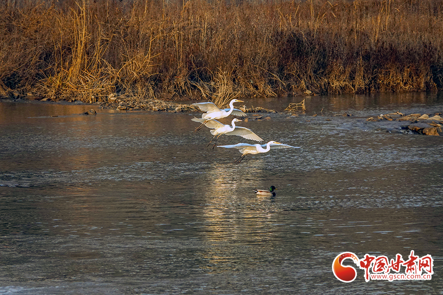冬日暖陽下,平?jīng)鍪谐缧趴h汭水河畔,波光與白鷺互為輝映,勾勒出一幅人與自然和諧相處的生態(tài)畫卷。