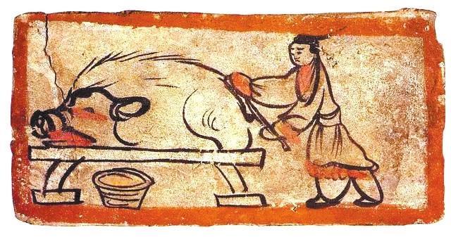 墓磚壁畫描述古人宰豬場(chǎng)景。