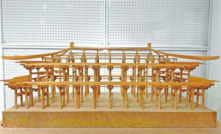“這是兩個(gè)學(xué)生共同完成的,是按照大明宮含元殿的木制結(jié)構(gòu)圖制作的。”彭維新說(shuō)。