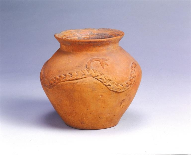 這條龍,是采用凸堆手法雕塑于一件無耳、束頸紅陶罐之上,它出土于臨夏廣河縣齊家坪遺址。別看它貌不驚人,和眾多同時期出土的陶罐也無二致,但它卻是一件國家一級文物。