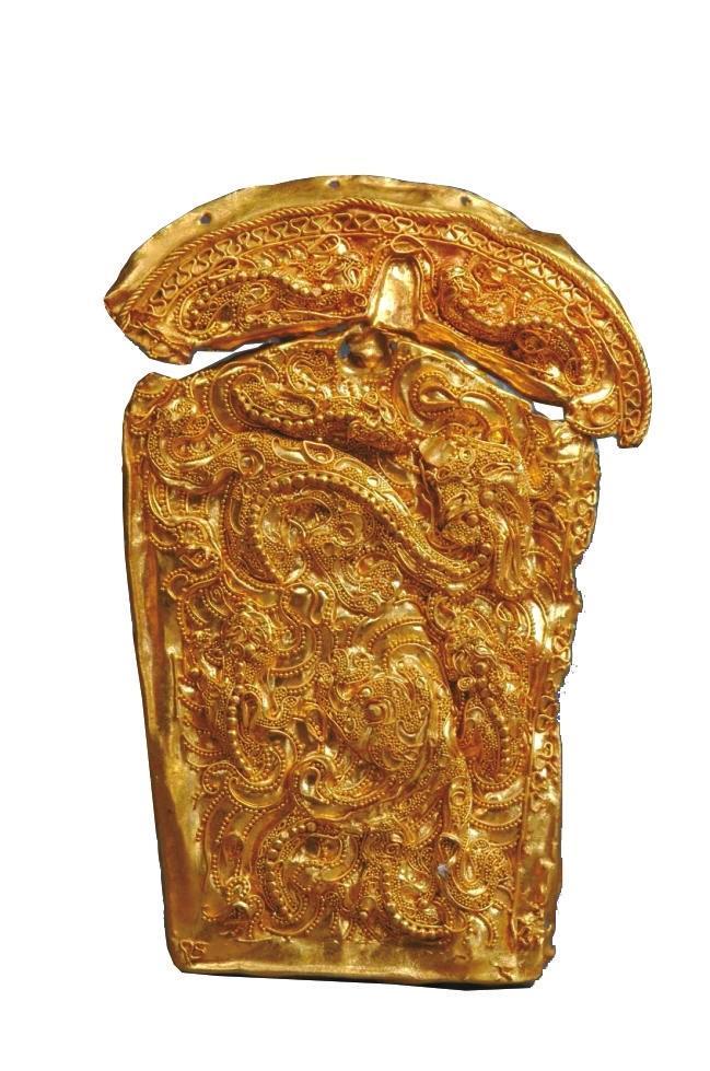 這件帶扣以黃金為質(zhì),應用多種黃金加工工藝打造而成。整件帶扣以金皮捶揲顯出七條龍的輪廓。