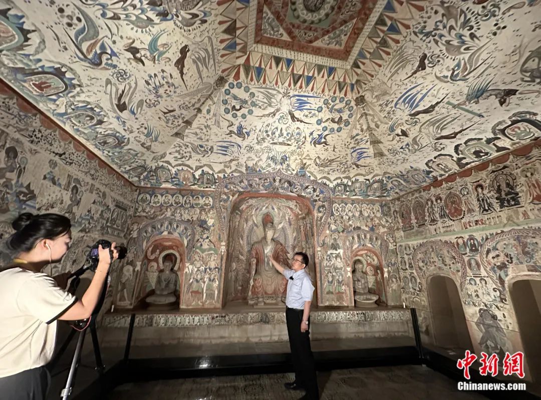 2023年7月,敦煌研究院副院長張元林在敦煌莫高窟第285窟原大復制窟內,接受中新社“東西問”獨家專訪。丁思 攝