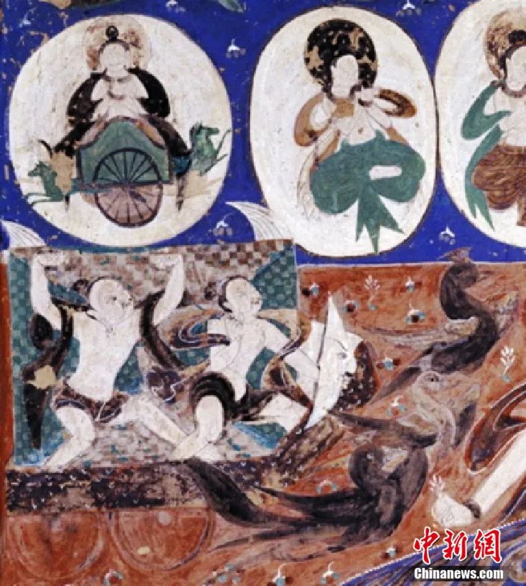 張元林:敦煌壁畫中,有中國傳統(tǒng)神話中的神靈形象,如東王公、西王母、菩薩、觀音、伏羲、女媧、雷公,以及青龍、白虎、朱雀、玄武等祥瑞動物和異獸形象;也有來自印度—西域典型的神靈形象,有阿修羅、迦樓羅(金翅鳥王)、緊那羅(樂天)、大蟒神等等。除印度佛教及其藝術影響外,具有波斯—中亞藝術典型特色的連珠紋、對鳥對獸紋在敦煌壁畫中也非常流行;壁畫人物頭飾“三面寶冠”上裝飾的月形、日月形飾物題材,來源于薩珊波斯。又如北朝時期敦煌壁畫中的人物造型風格,既有西域式的“龜茲風”,又有來自中原、南朝的“褒衣博帶”“秀骨清像”式。