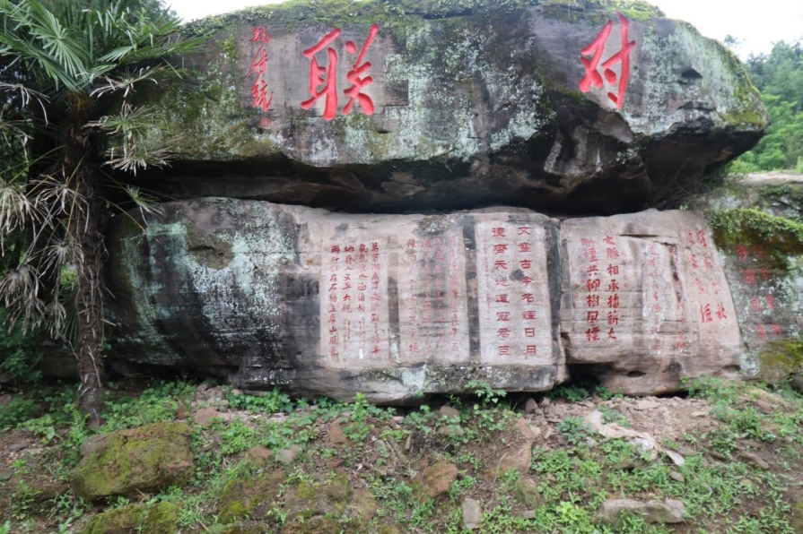 山上隨處是石,或臥或立,俱有雄獅虎豹之勢(shì);或平或峻,皆作岡陵之態(tài)。青峰續(xù)脈,絕頂鷹飛。鑿巖壁以造法像,栩栩如臨宮闕;摩巨石而鐫嘉聯(lián),文華直射牛斗。石多瑰偉,苔覆璞瑜,油菜花點(diǎn)綴其間,引來(lái)蜜蜂蝴蝶共舞。山茶與毛竹同畦,郁郁蔥蔥;峰巒與云煙共養(yǎng),莽莽蒼蒼。遇目石上鐫字,瀏賞翰墨煙霞;振藻揚(yáng)毫,皆寰中俊杰;椽筆斯文,多隴蜀賢達(dá)?;虺嘧痈文?,燭照于史;或凜然浩氣,嘯傲大千。聯(lián)壁生輝,文曲星彰;峣巖開竅,氣通神明。文采煥然與星河同輝,詩(shī)儕競(jìng)秀潤(rùn)厚山玉顏。壯懷詩(shī)夢(mèng),漱玉溪流。在一塊巨石斜面上,有同伴發(fā)現(xiàn)刻有筆者所書長(zhǎng)聯(lián),興奮得喊叫起來(lái)。這是三年前應(yīng)曹興章先生之約而作,聯(lián)曰:翰墨生輝,千秋勝景開仙境;源泉流韻,萬(wàn)象韶光耀厚山。我用手指扣去筆畫生出的茂密青苔,坐下來(lái)與我的聯(lián)合影留念。信是蓮花開石上,遙遙至此結(jié)仙緣。