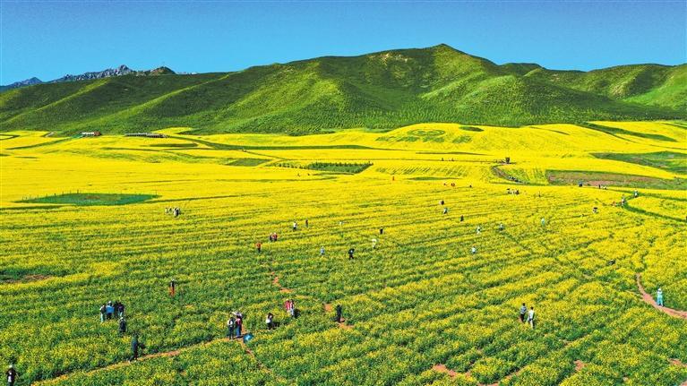 一路前行,一路風(fēng)景。一片片的油菜花開(kāi)得生機(jī)勃勃,連天接地,引得游人駐足拍照。萬(wàn)畝油菜花海隨風(fēng)起伏,如同時(shí)間長(zhǎng)河里濺起的金色浪花,游人穿行于花海中,臉上都露出了孩子般的笑容,愜意而放松……