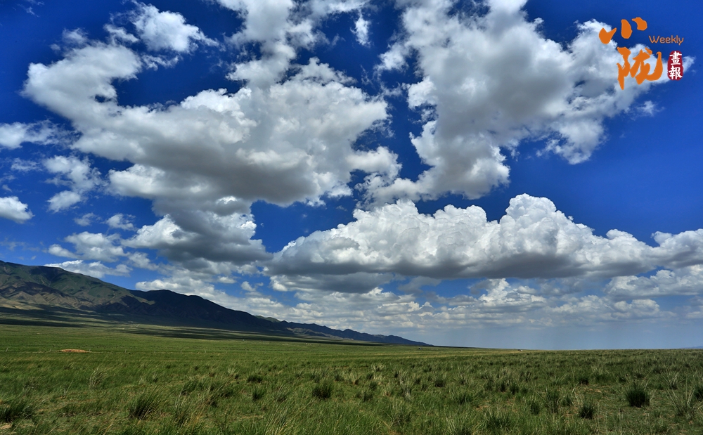 遠(yuǎn)處白云悠悠,百萬畝草原一望無垠,羊群點(diǎn)綴的大草原和那殘存的烽火臺(tái)相映成趣,呈現(xiàn)出一幅綠意盎然的詩意畫卷。