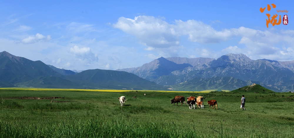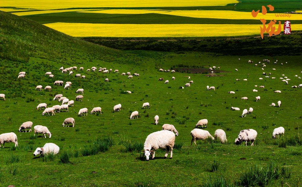 一眼望去,碧綠一片,風(fēng)景秀美。羊群放牧于焉支山下的大草原上,金黃的油菜花、無邊的草原,氣勢壯觀。