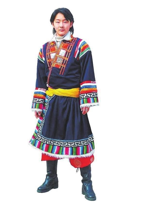 甘肅藏族因地理條件與生產(chǎn)生活方式的不同,可區(qū)分為牧區(qū)、農(nóng)區(qū)和半農(nóng)半牧區(qū)三種類型,相應(yīng)其服飾也有所差異,有生活裝和節(jié)日盛裝的區(qū)別。牧區(qū)服飾以甘南瑪曲、夏河為典型,男女都內(nèi)著半高領(lǐng)、左衽的滾邊夾襖,多用紅、綠、藍(lán)、褐色綢緞制作,喜歡用水獺皮等裝飾衣襟邊。夏日穿氆氌做的“日拉”,春秋穿羊羔皮做里,外罩綢緞面的“察日”,冬天穿大羊皮縫制的“早化”。男款袍服寬大,冬袍領(lǐng)子鑲豹皮;現(xiàn)代女款藏袍吸收了近現(xiàn)代旗袍的特點(diǎn),注意腰身的裁剪設(shè)計,領(lǐng)部鑲豹皮,在領(lǐng)角處裝飾彩色布條;襟裙下擺和袖口處多疊綴三種紋樣的氆氌,或用白羔皮、水獺皮和織錦花邊依次裝飾。