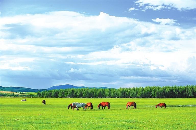 置身草原,高遠空曠的天空下面,是明凈遼闊的草場,白色的羊和黑色的牛像灑落在草叢中的白珍珠和黑珍珠,一頂頂帳篷點綴其間,不遠處,有游人騎在馬背上,優(yōu)哉游哉,或拍照或奔馳。這里一年四季景色都十分迷人:春天山花爛漫,姹紫嫣紅,如煙如夢;夏季綠草如茵,碧波浪涌,養(yǎng)心養(yǎng)眼;秋天云纏霧繞,層林盡染,美麗迷人;冬天銀裝素裹,瓊花玉樹,一派北國風光。