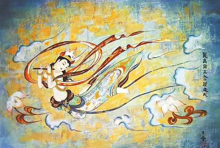 敦煌莫高窟,窟窟有壁畫,拼接起來(lái)長(zhǎng)達(dá)45000多平方米,有世界上“最大畫廊”之稱。這些壁畫中,幾乎每幅都有舞蹈形象,如在窟頂、龕楣、藻井遨游的飛天,憑欄上的天宮伎樂,經(jīng)變畫中的娛佛、敬佛的獻(xiàn)舞者——伎樂天,出行圖中跳著具有濃郁生活氣息的世俗樂舞,以及富有舞蹈美感的彩塑菩薩、天王力士等,琳瑯滿目,精妙絕倫。這些舞蹈形象充分反映了從十六國(guó)北朝至元代千余年來(lái)不同歷史時(shí)期的舞蹈服飾、形態(tài)、風(fēng)貌,為我們挖掘、整理、弘揚(yáng)中華民族舞蹈文化提供了十分珍貴的形象資料。