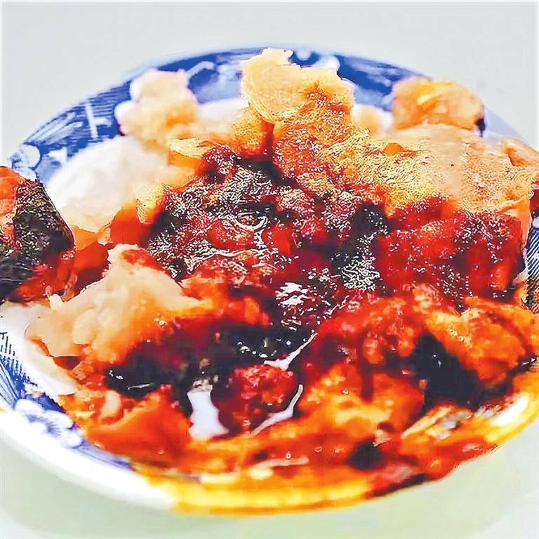 況且,一碗手搟粉里,如果啃上一個底和邊烤得脆脆的豬油盒子,手搟粉麻辣鮮香的料汁可以為豬油盒子的味道錦上添花,同時脆的口感又能與充滿韌性的手搟粉相得益彰,珠聯(lián)璧合。