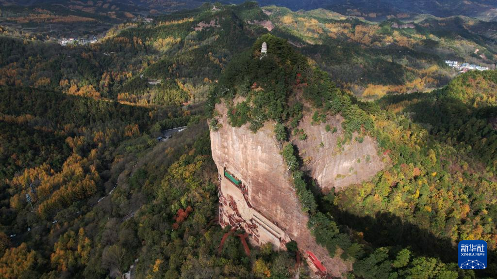 這是11月2日拍攝的麥積山石窟秋景(無人機照片)。新華社記者 陳斌 攝