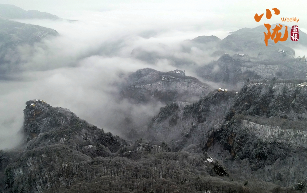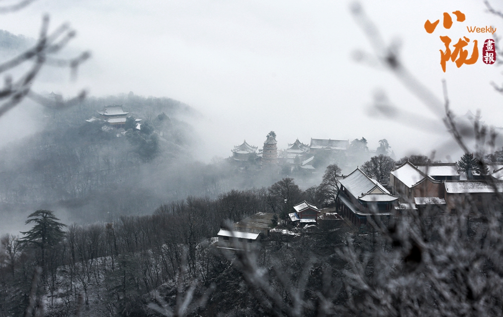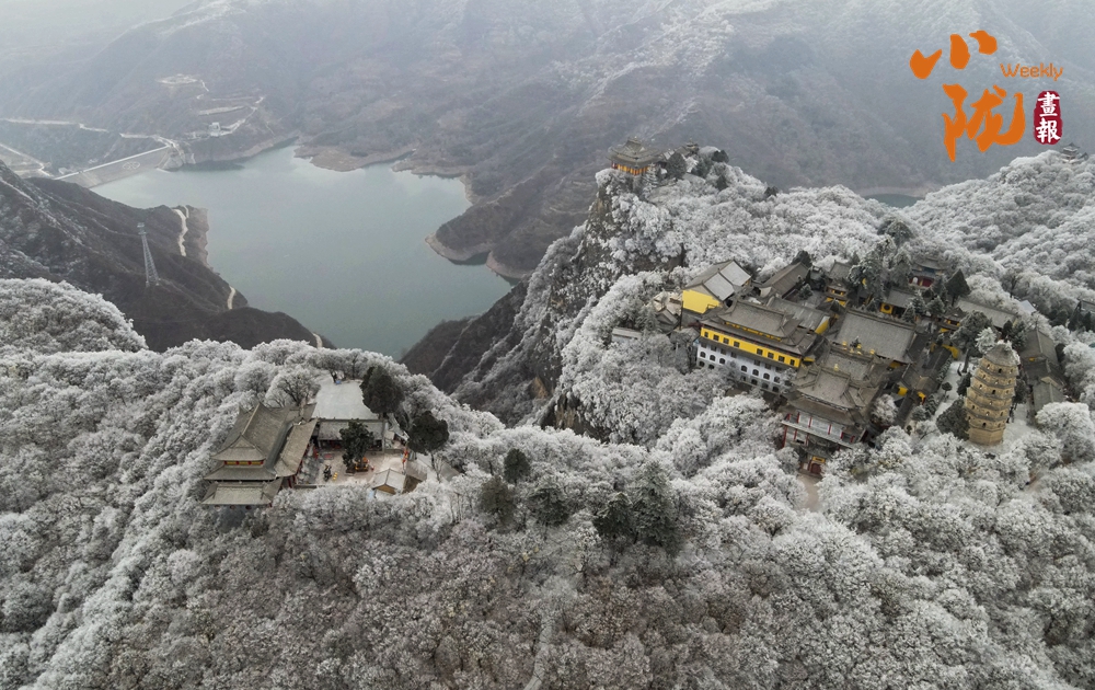 輕薄的雪花落在崆峒山巔,銀裝素裹下的樹木古剎和山下的湖泊美景分外迷人。