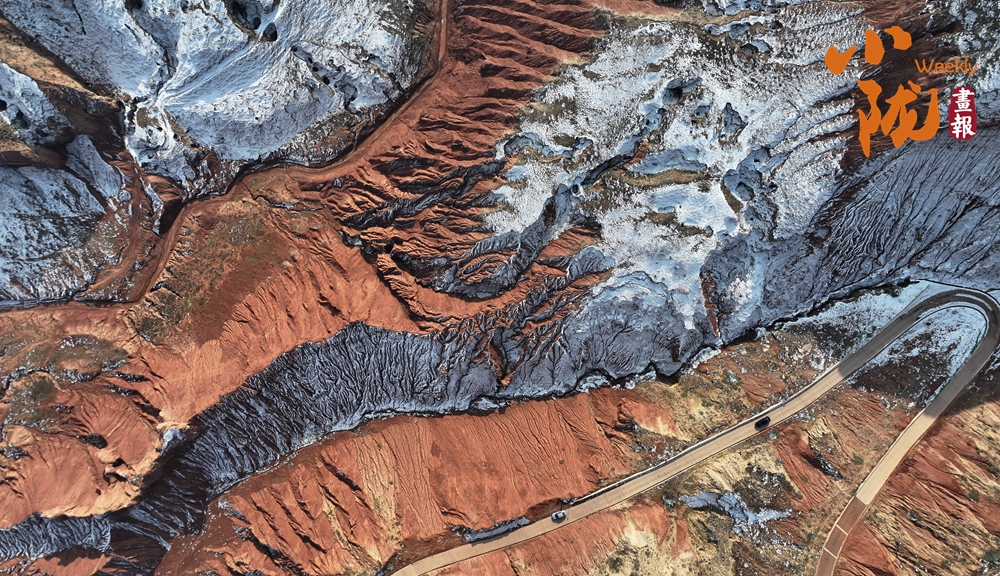 冬雪覆蓋在色彩斑斕的丹霞地貌之上,從高空俯視,層理交錯(cuò),色彩鮮艷,似一幅油畫(huà)。