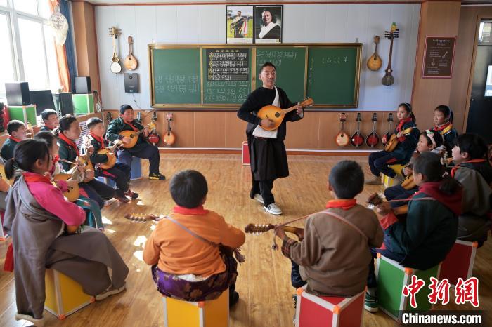 2月26日,甘肅省甘南藏族自治州瑪曲縣寄宿制藏族小學(xué)龍頭琴彈唱社團(tuán)活動(dòng),加措正在教孩子們彈唱。九美旦增 攝