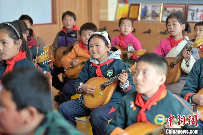 2月26日,甘肅省甘南藏族自治州瑪曲縣寄宿制藏族小學(xué)龍頭琴彈唱社團(tuán)活動(dòng),學(xué)生們正在練習(xí)。九美旦增 攝