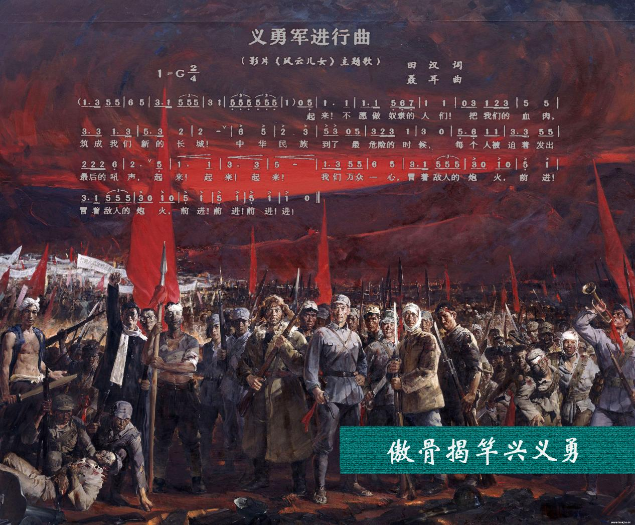 ?、菀磺耧j:指《義勇軍進行曲》?!?a >義勇軍進行曲》面世后,立即成為廣泛流傳的抗戰(zhàn)歌曲。世界反法西斯戰(zhàn)爭即將結束之際,該曲被選入反法西斯盟軍勝利凱旋的曲目。戰(zhàn)爭結束后,同盟國集會時,《義勇軍進行曲》作為代表中國的歌曲演奏。美國還將該曲與美國的《美麗的美利堅》、法國的《馬賽曲》等歌曲定為同盟國勝利之日的音樂節(jié)目廣播歌曲。1949年9月27日,中華人民共和國人民政治協(xié)商會議第一屆全體會議通過決議,《義勇軍進行曲》為代國歌。1982年12月,中華人民共和國第五屆全國人民代表大會第五次全體會議確定《義勇軍進行曲》為中華人民共和國國歌。2004年3月14日,中華人民共和國第十屆全國人大二次會議通過的憲法修正案規(guī)定“中華人民共和國國歌是《義勇軍進行曲》”?!读x勇軍進行曲》作為國歌,正式被寫入中華人民共和國憲法。