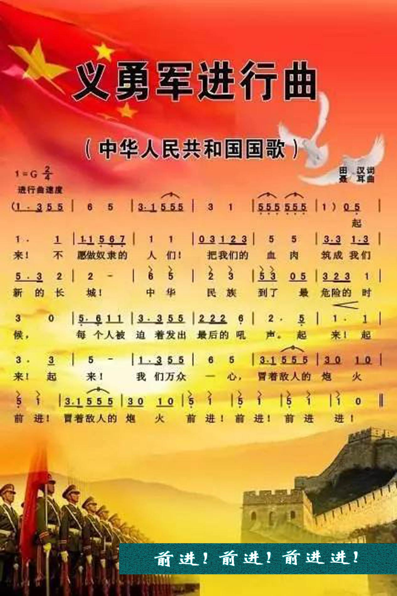 ⑧前進!前進!前進進?。骸读x勇軍進行曲》這一段歌詞是作曲家聶耳改定的。為了使歌曲曲調(diào)和節(jié)奏更加有力,聶耳把田漢原來的“我們?nèi)f眾一心,冒著敵人的飛機大炮前進。前進!前進!前進!”改為“我們?nèi)f眾一心,冒著敵人的炮火,前進!冒著敵人的炮火,前進!前進!前進進!”全國政協(xié)委員、國家一級指揮、解放軍軍樂團前團長于海曾談到:“前進,前進,前進進!”這七個字堪稱國歌的點睛之筆。“前進進”的節(jié)奏感,凸顯了國歌精神的進行時態(tài)。正是這種精神一直在指引我們,激勵著我們。