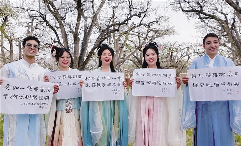 在接下來(lái)的詩(shī)詞互動(dòng)環(huán)節(jié),外籍留學(xué)生開啟換裝模式,身著漢服,徜徉在梨花樹下,吟誦著“梨花”主題的詩(shī)句,感受中國(guó)漢服之美和中國(guó)傳統(tǒng)文化的魅力。換裝后的外籍留學(xué)生也讓梨園秒變“出片現(xiàn)場(chǎng)”。“這是我第一次穿漢服,穿著漢服在梨園里拍的照片真的很好看。”來(lái)自越南的黃青草,迫不及待地想把這份梨園的浪漫春日記憶分享給自己的同學(xué)、朋友。