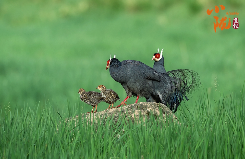 珍貴稀有的國家二級重點(diǎn)保護(hù)動(dòng)物藍(lán)馬雞,體型較大,通體藍(lán)灰色,頸項(xiàng)和肩部顏色更深,閃爍著金屬般的輝亮。其尾羽特別長,由灰藍(lán)色漸變?yōu)榘底纤{(lán)色,并渲染著金屬綠和金屬紫藍(lán)色,24枚尾羽中,中央一對尾羽特別長,富有彈性,彎曲成一個(gè)美麗的弧形,高高地翹在其他尾羽之上,披散下垂如馬尾,因而得名。此外,藍(lán)馬雞的頭側(cè)緋紅,耳羽簇白色并突出于頸部頂上,為其增添了獨(dú)特的魅力。