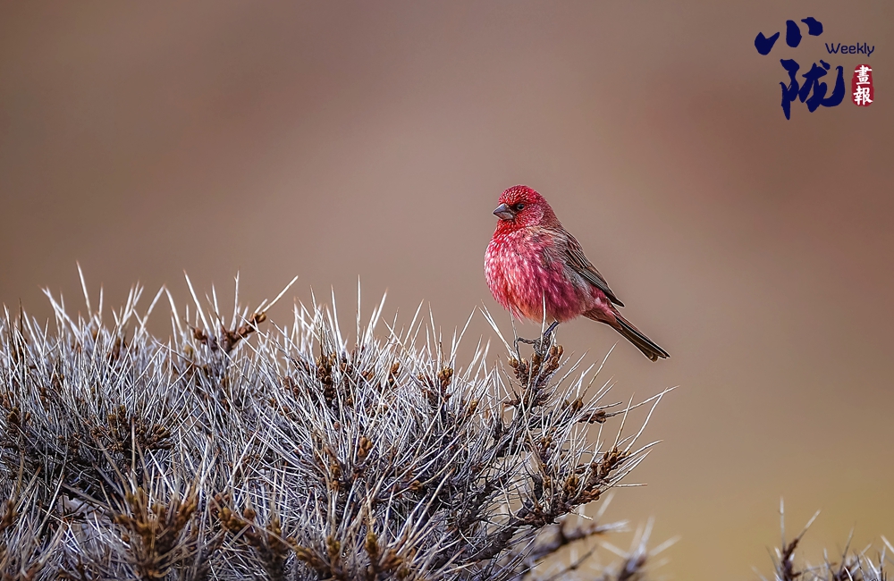 紅眉朱雀,是雀形目燕雀科朱雀屬的鳥類,中等體型,體長約為15厘米。雄鳥的特征是眉紋和臉頰呈淡紫粉色,而上體則有褐色斑駁。雌鳥沒有粉色,難稱“漂亮”,它們?nèi)砘液稚?,?ldquo;朱”一點(diǎn)也不沾邊兒,實(shí)際上,很多鳥類的雌鳥都要比雄鳥暗淡很多,這種暗淡的顏色能幫助它們在孵卵的時(shí)候更好地隱蔽,以逃過天敵的捕殺。雄鳥和雌鳥都類似于體型較小的曙紅朱雀。