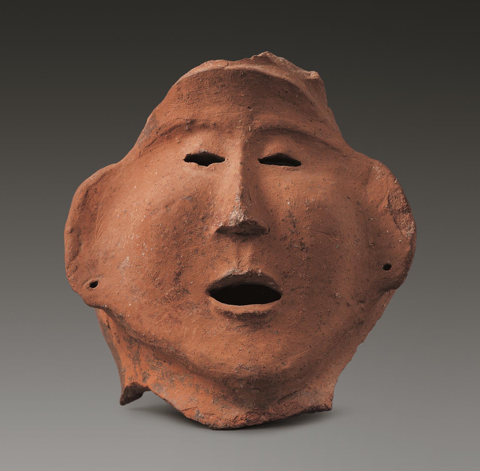 仰韶文化石嶺下類(lèi)型(距今5200年前)天水市柴家坪出土殘高15.3厘米,寬14.6厘米。人像高顴闊面,眉稍隆起,嘴、眼鏤空成橫條狀,鼻呈三角形,兩耳垂各有一穿孔。
