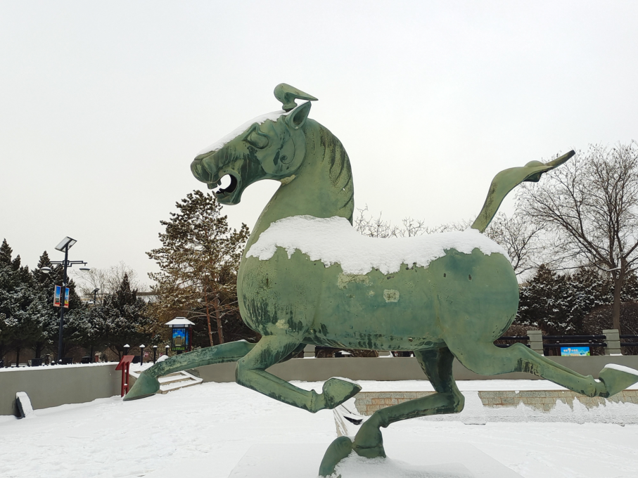 厚德載物的包容精神。特殊的地理環(huán)境,造就了涼州馬文化兼容并蓄、厚德載物的精神特質(zhì)。涼州大馬是中原馬、西域馬與蒙古馬雜交改良的產(chǎn)物,既保留了蒙古馬的耐力,又兼具西域馬的速度,這種“取長補(bǔ)短”的改良過程,本身就是包容精神的具體體現(xiàn)。“馬踏飛燕”作為東西方文化融合的藝術(shù)結(jié)晶,其形象既源于中原的“龍馬精神”,又吸納了西域“翼馬”的神話元素,成為兼容并蓄精神的具象化表達(dá)。它的鑄造工藝同樣展現(xiàn)出包容的特質(zhì),既采用了中原傳統(tǒng)的陶范鑄接法,又融入了西域藝術(shù)的浪漫主義風(fēng)格,寫實(shí)與想象完美結(jié)合,形成了形神兼?zhèn)洹忭嵣鷦拥乃囆g(shù)效果。