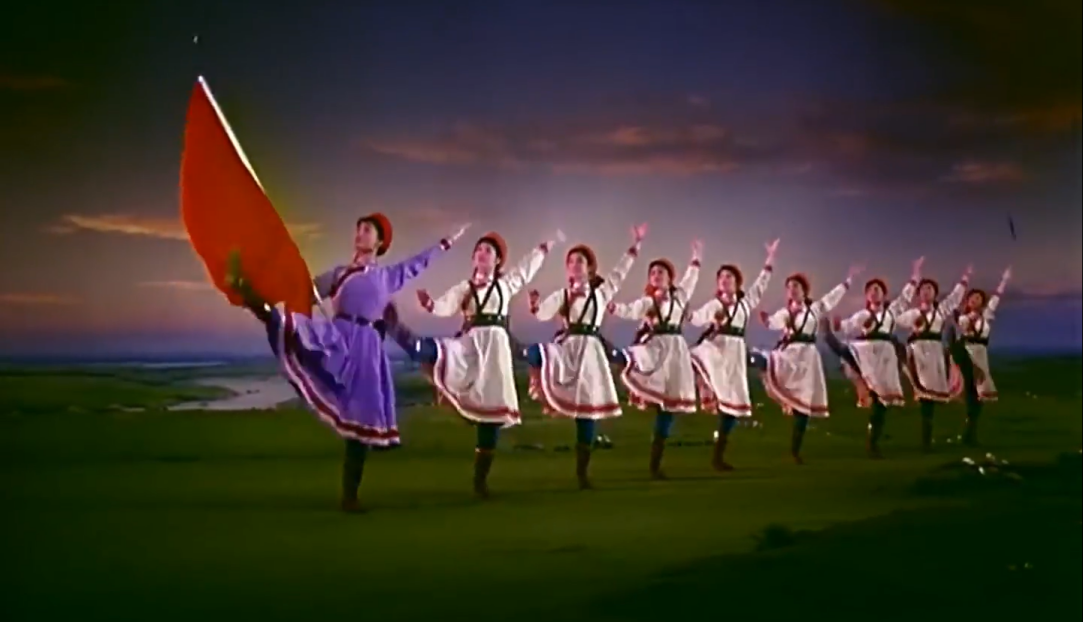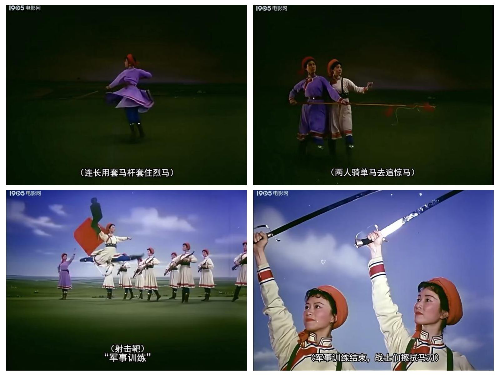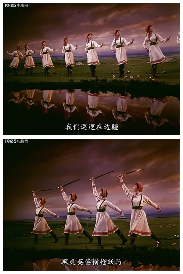 《草原女民兵》最初作為舞臺(tái)舞蹈,其美學(xué)特質(zhì)建立在現(xiàn)場(chǎng)性、即時(shí)性與三維空間性之上。而當(dāng)它通過(guò)《百花爭(zhēng)艷》的鏡頭被重新詮釋時(shí),經(jīng)歷了一場(chǎng)深刻的美學(xué)轉(zhuǎn)換。電影不僅記錄了這一舞蹈,更通過(guò)其特有的語(yǔ)言系統(tǒng),對(duì)舞蹈進(jìn)行了二次創(chuàng)作與美學(xué)升華。