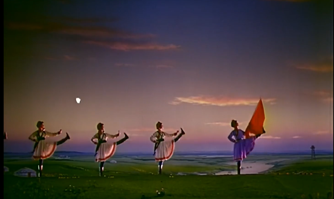 值得注意的是,《百花爭(zhēng)艷》并非簡(jiǎn)單地對(duì)舞臺(tái)演出進(jìn)行機(jī)械記錄,而是經(jīng)過(guò)了精心的電影化設(shè)計(jì)與重構(gòu)。導(dǎo)演、攝影師與舞臺(tái)編導(dǎo)密切合作,在保持舞臺(tái)藝術(shù)核心魅力的同時(shí),充分運(yùn)用電影語(yǔ)言對(duì)其進(jìn)行“轉(zhuǎn)譯”與“強(qiáng)化”。這種創(chuàng)作理念,使得最終呈現(xiàn)的《草原女民兵》已不再是單純的舞臺(tái)記錄,而是一部具有獨(dú)立審美價(jià)值的電影舞蹈作品。
