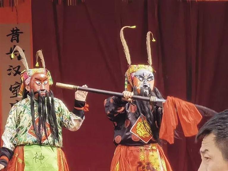 隴南市武都魚龍鄉(xiāng)陽山村高山戲又稱“演故事”“走過場”等,發(fā)源于隴南武都高山地區(qū),是從隴南當(dāng)?shù)氐拿耖g祭祀活動和傳統(tǒng)社火中孕育、演變而來的戲曲劇種。高山戲演出程式多種多樣,語言生動活潑、幽默詼諧,2008年被列入第二批國家級非物質(zhì)文化遺產(chǎn)保護名錄。停止演出近20年后,在當(dāng)?shù)匚幕鞴懿块T的大力支持下,2022年正月陽山村恢復(fù)了高山戲的演出。
