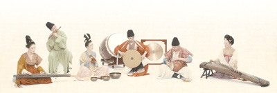 淡黃色的背景如宣紙鋪陳,樂師們身著朱紅圓領袍、艾綠上衣、藕色絹衫等,或撫古琴,或吹笛簫,或擊大鼓……演奏的是中國傳統(tǒng)樂器,流淌的樂音卻是電影《哈利·波特》主題曲、巴赫《G弦上的詠嘆調》……