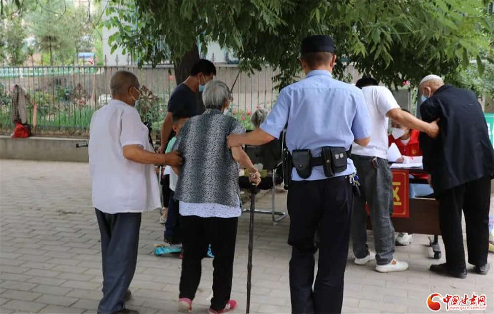 紅古分局海石灣派出所民警在核酸采樣點主動攙扶行動不便的老人進(jìn)行核酸采樣。紅古分局 張 鼎/攝