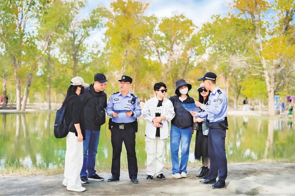 “壯美的胡楊,旖旎多姿的美景風(fēng)光,讓人不知不覺醉迷其中,景區(qū)隨處可見執(zhí)勤的民輔警,在這里旅游感覺安全感爆棚!”一位來自成都的游客鄧女士說。