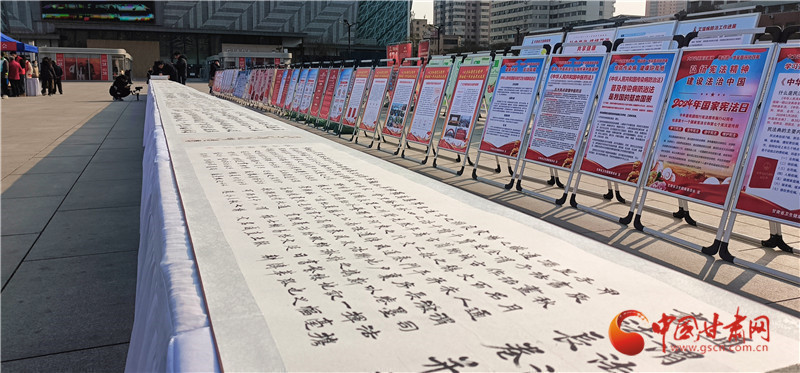 活動(dòng)現(xiàn)場(chǎng),省委宣傳部、省委政法委、省法院、省檢察院等20余家單位結(jié)合行業(yè)實(shí)際,宣傳憲法,普及法律知識(shí),為群眾提供法律咨詢。為了豐富普法載體,讓群眾在互動(dòng)參與中學(xué)習(xí)法律知識(shí),活動(dòng)展出了由定西市通渭縣司法局聯(lián)合書(shū)法家、師生群體、法官、檢察官、公安民警等各行各業(yè)工作人員創(chuàng)作的百米《書(shū)·法》長(zhǎng)卷,鐫刻法治精神,書(shū)寫(xiě)法律法規(guī)?,F(xiàn)場(chǎng)還表演了精彩的文藝節(jié)目。